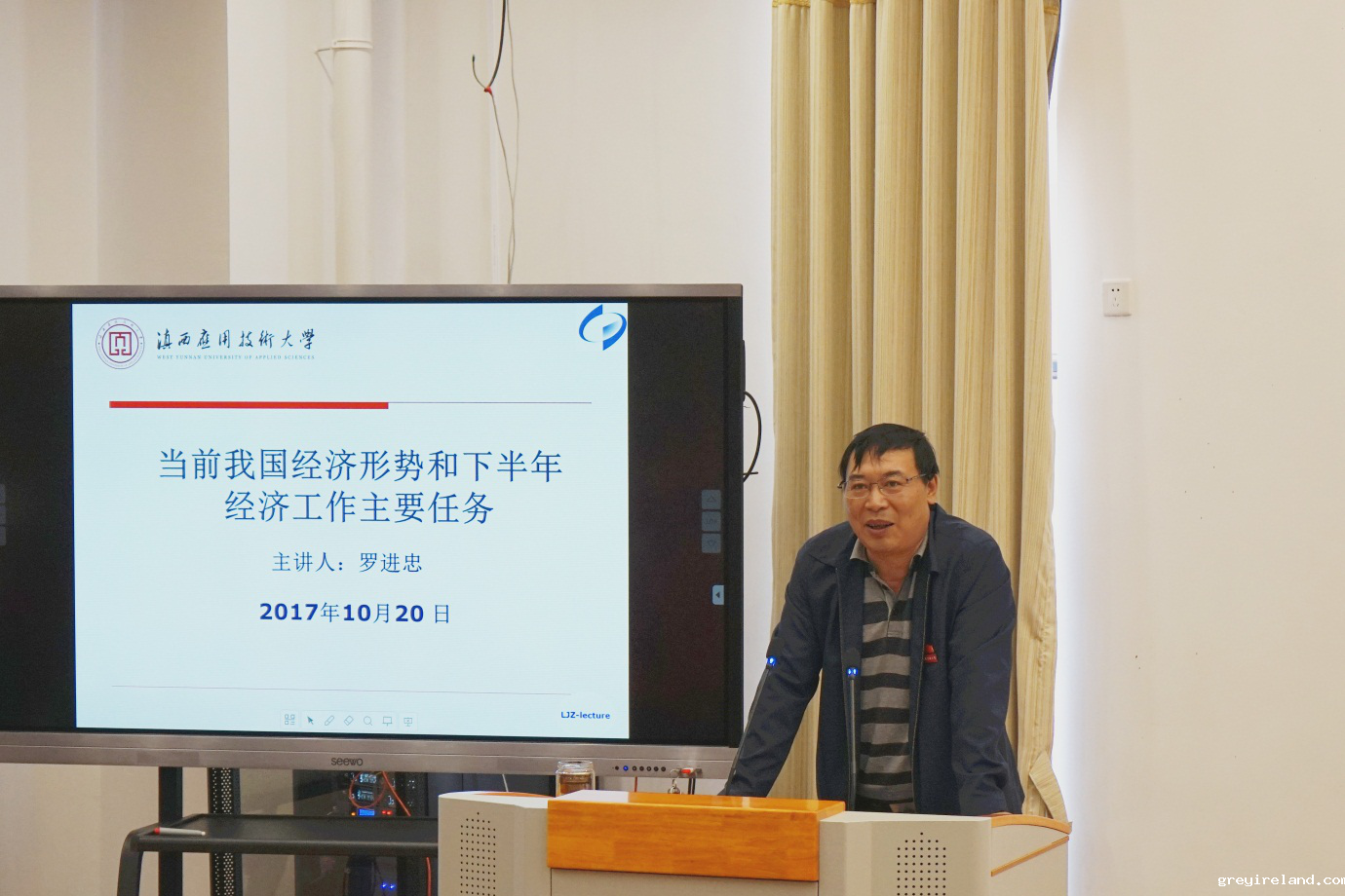 罗进忠紧密结合正在召开的党的十九大报告精神,用翔实的经济发展数字,说明了国家、云南省及大理州近五年经济建设取得的重大成就;从判断国际经济走势的四个指标入手,利用数据引导师生科学、准确把握我国经济的发展形势。通过对比分析2017年上半年国家、云南省和大理州的主要经济指标,如综合、农业、工业、商业、财政、人民生活等,并结合自己在经济领域多年的工作经历,指出下半年国家经济工作仍然是稳中求进,云南省乃至大理州的经济发展任务依然艰巨。在经济发展中出现周期性波动是正常现象,我们应该客观评价和对待;从纵向、横向、全面、结构、重点、行政、技术等方面分析,我们对国家经济发展仍然信心十足。相信在党的十九大的引领下,我国将会顺利实现既定目标。 “青年兴则国家兴,青年强则国家强”,罗进忠借用习总书记十九大报告的讲话,“要坚定理想信念,志存高远,脚踏实地,勇做时代的弄潮儿,在实现中国梦的生动实践中放飞青春梦想,在为人民利益的不懈奋斗中书写人生华章!”激励学校广大青年教师和新生奋发有为,要有时不我待的紧迫感,既打牢理论功底又及时更新知识,不断提高与时代发展和事业要求相适应的素质和能力。 同学们对罗书记的形势与政策讲座积极响应、反映良好。通过此次讲座,同学们对国家、云南省、大理州当前的经济形势有了进一步的了解,同时对青年的担当和责任有了更深刻的感悟,对以后的学习及职业选择有了更明确的方向。